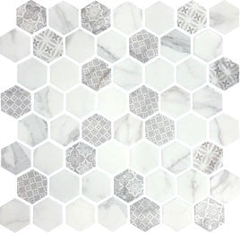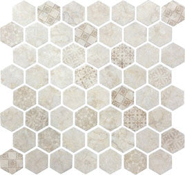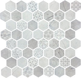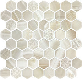 Stone-looks and decorative patterns collide to bring geometric flair to your space. ARTISAN is a pressed glass hexagon mosaic, blended in four neutral color palettes and designs. This collection offers a more durable product than its stone alternatives, allowing for more application opportunities for both walls and floors.
